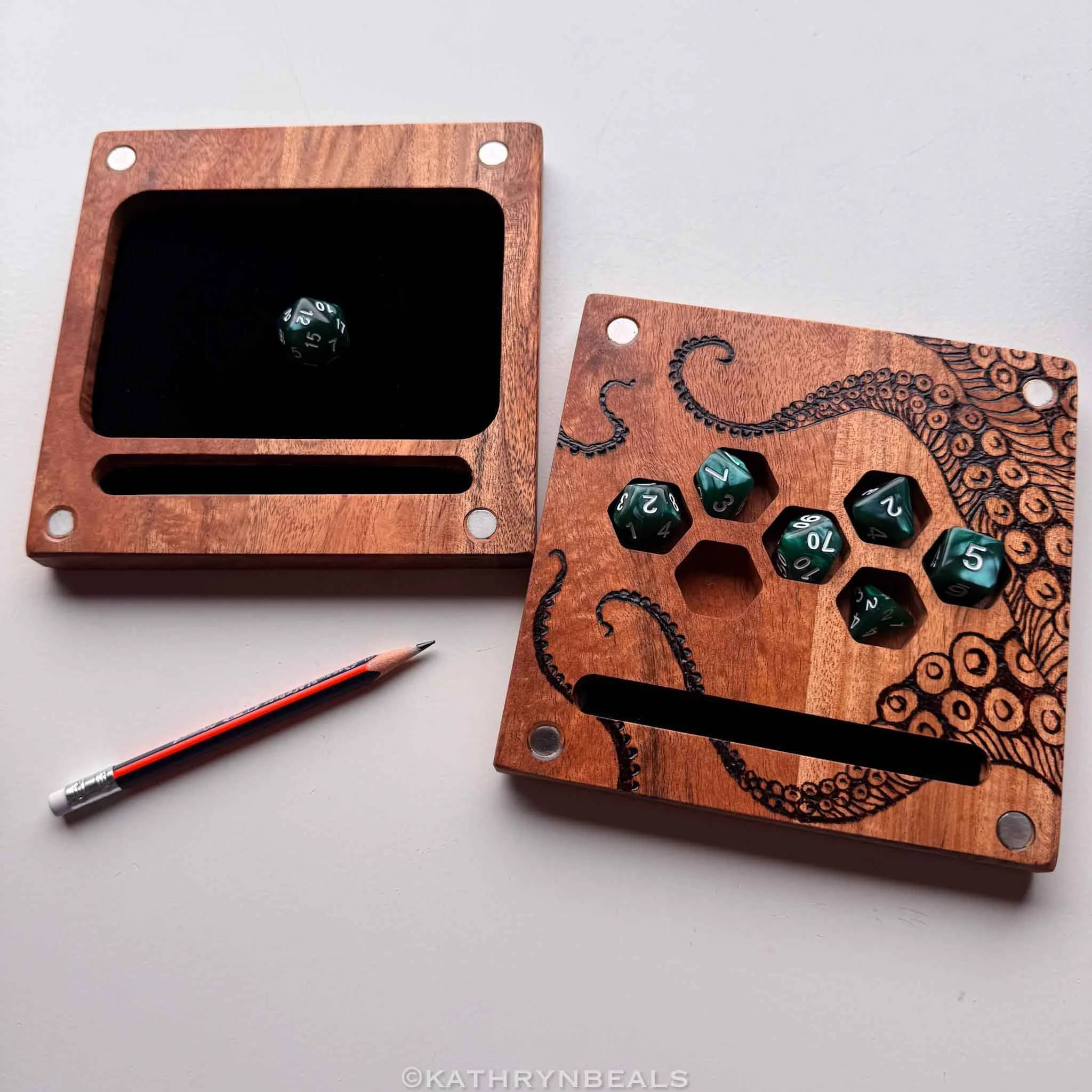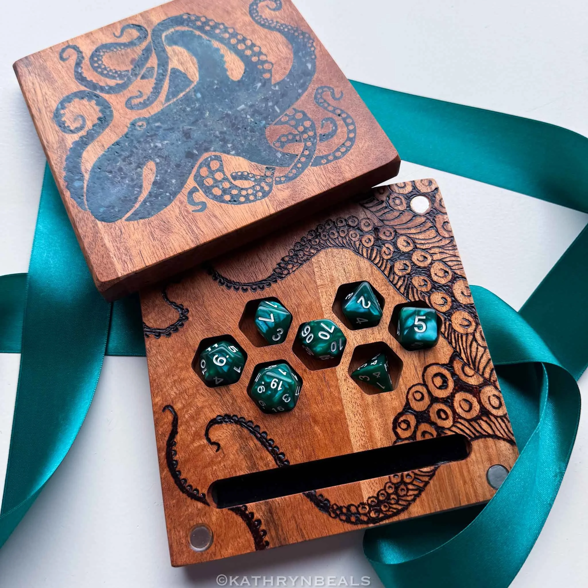 This custom dice box for D&D or other tabletop games was made in Kathryn's workshop from an upcycled acacia cutting board. The front features one of her octopus designs, carved and inlaid with a mixture of resin and crushed local mussel shells. The inside features hand-burned octopus tentacles. The box separates into two halves, held together by four magnets. The inside features six hexagonal recesses to store dice, a velvet-lined surface for rolling into, and a pencil. Folded together, the box measures approximately 6” square by 0.75” deep. Set includes the box, dice and pencil.