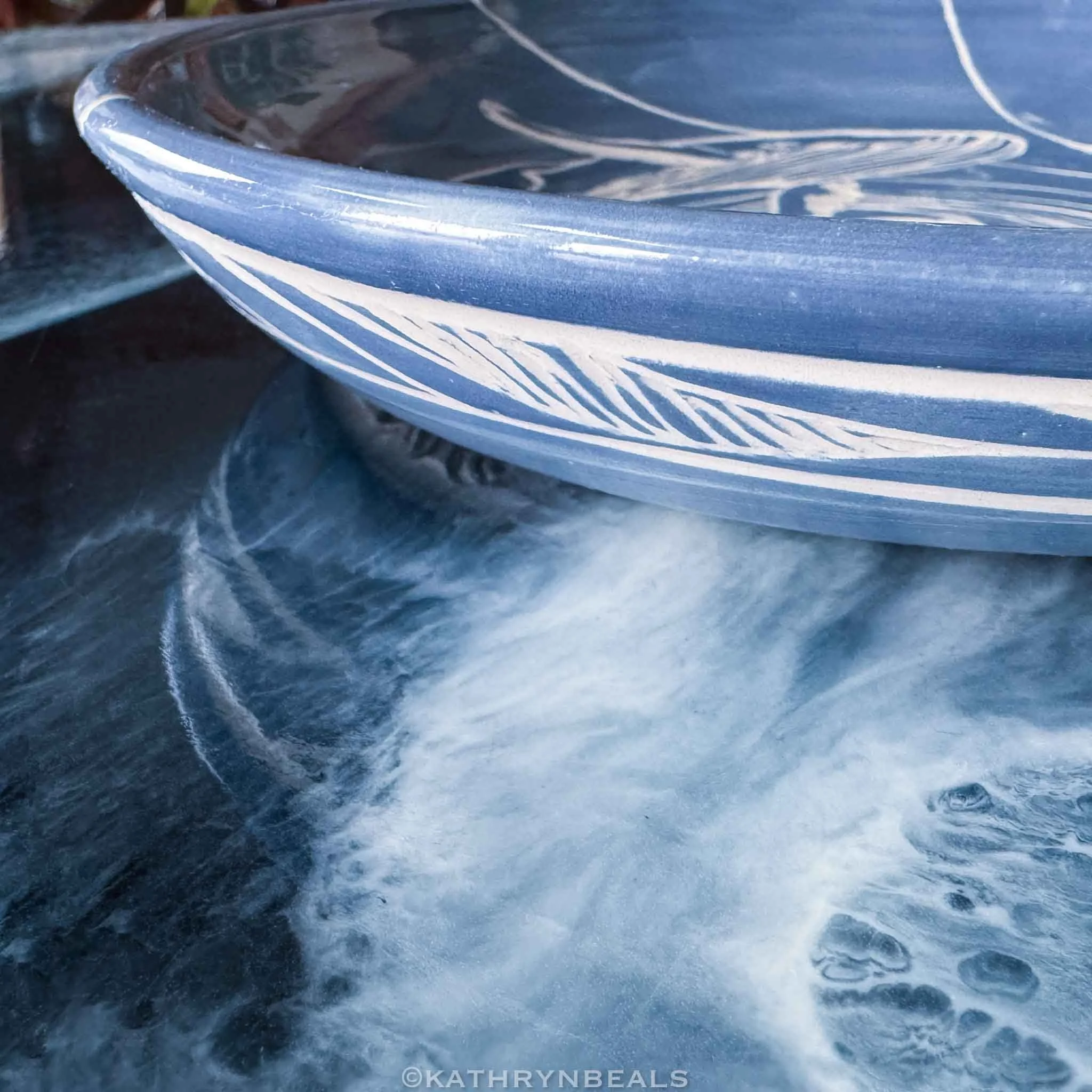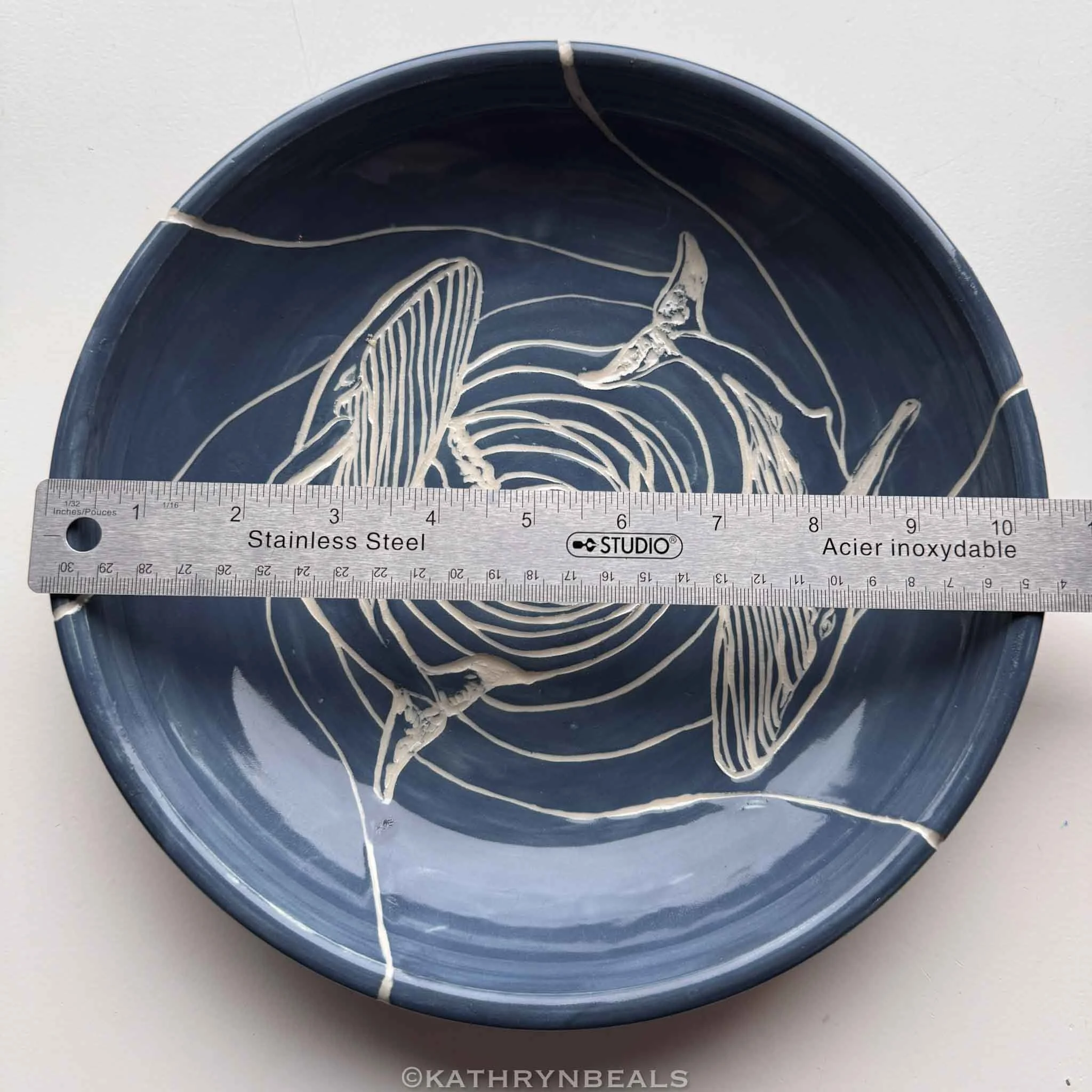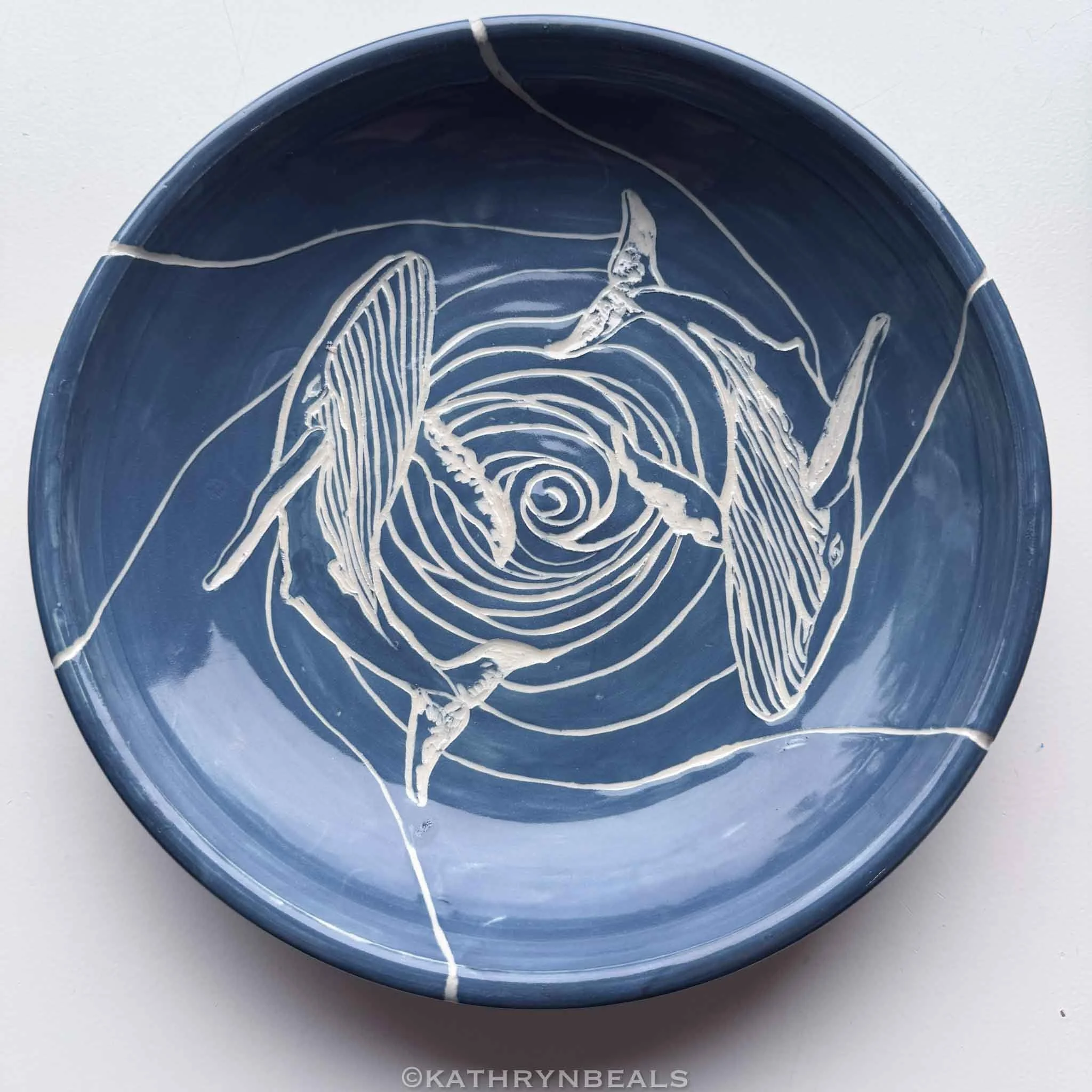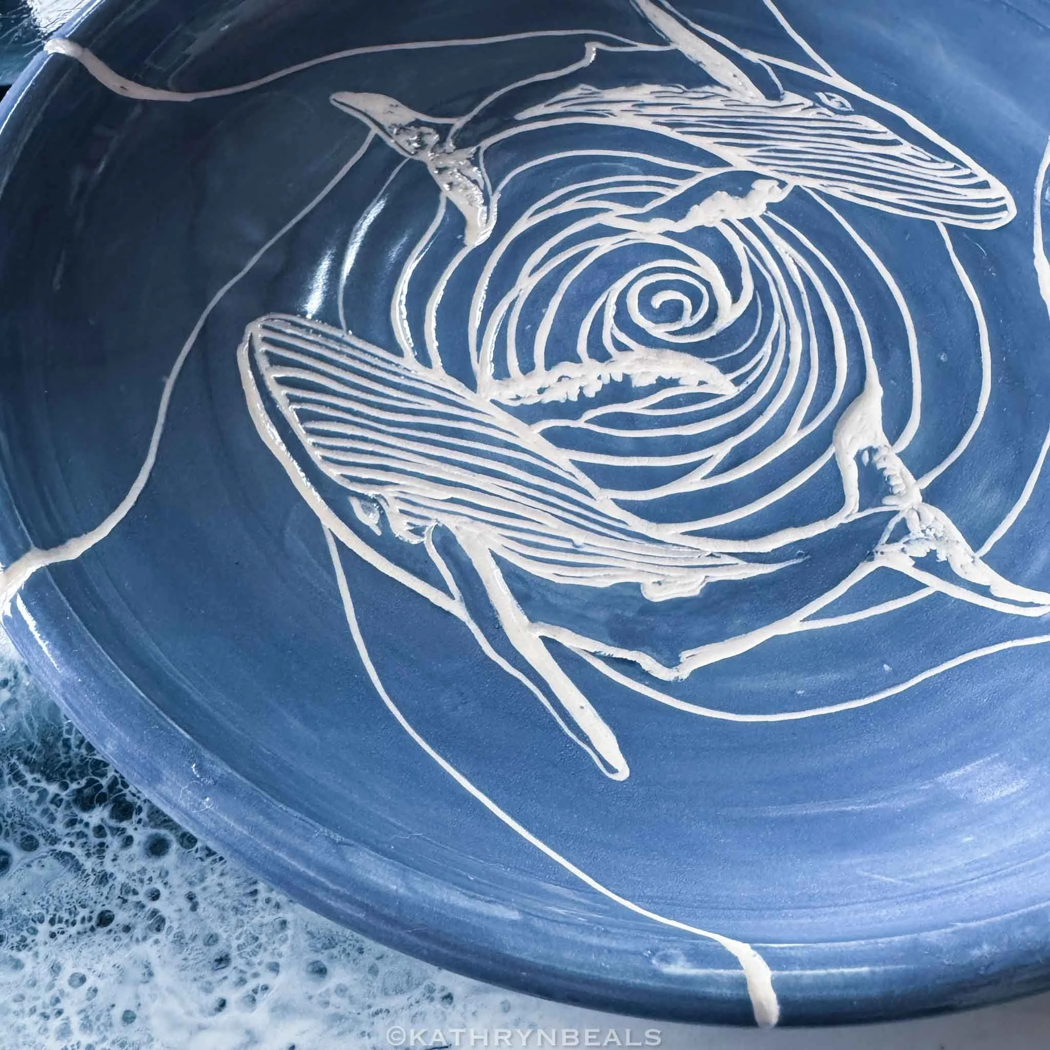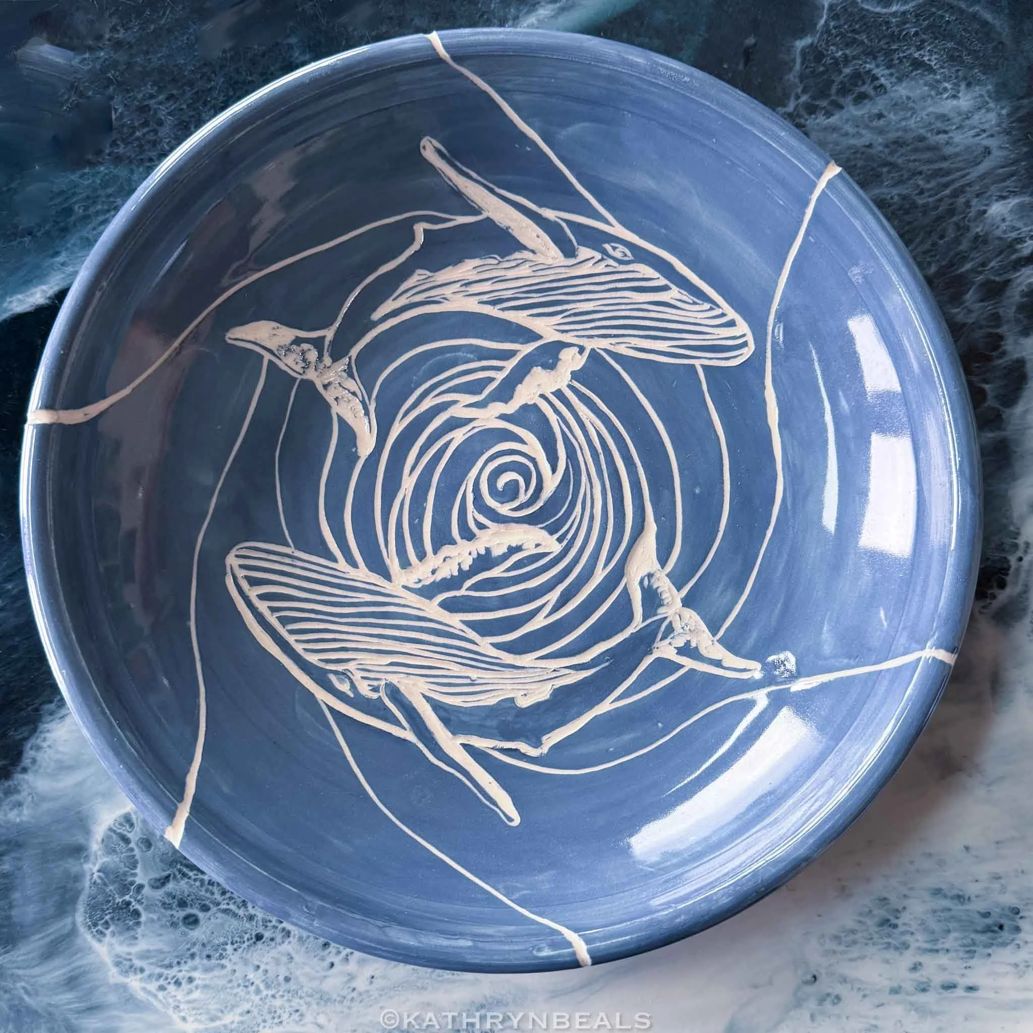This is a collaboration of Kathryn x Catherine, two BC artists with the same name who both love humpbacks. This pie plate is thrown in stoneware clay by potter Catherine Epps, and hand-carved by Kathryn Beals. This stoneware clay, oven safe dish is painted in grey-blue underglaze and measures approximately 10.5” wide by 1.5” high. See other collaboration pottery here.