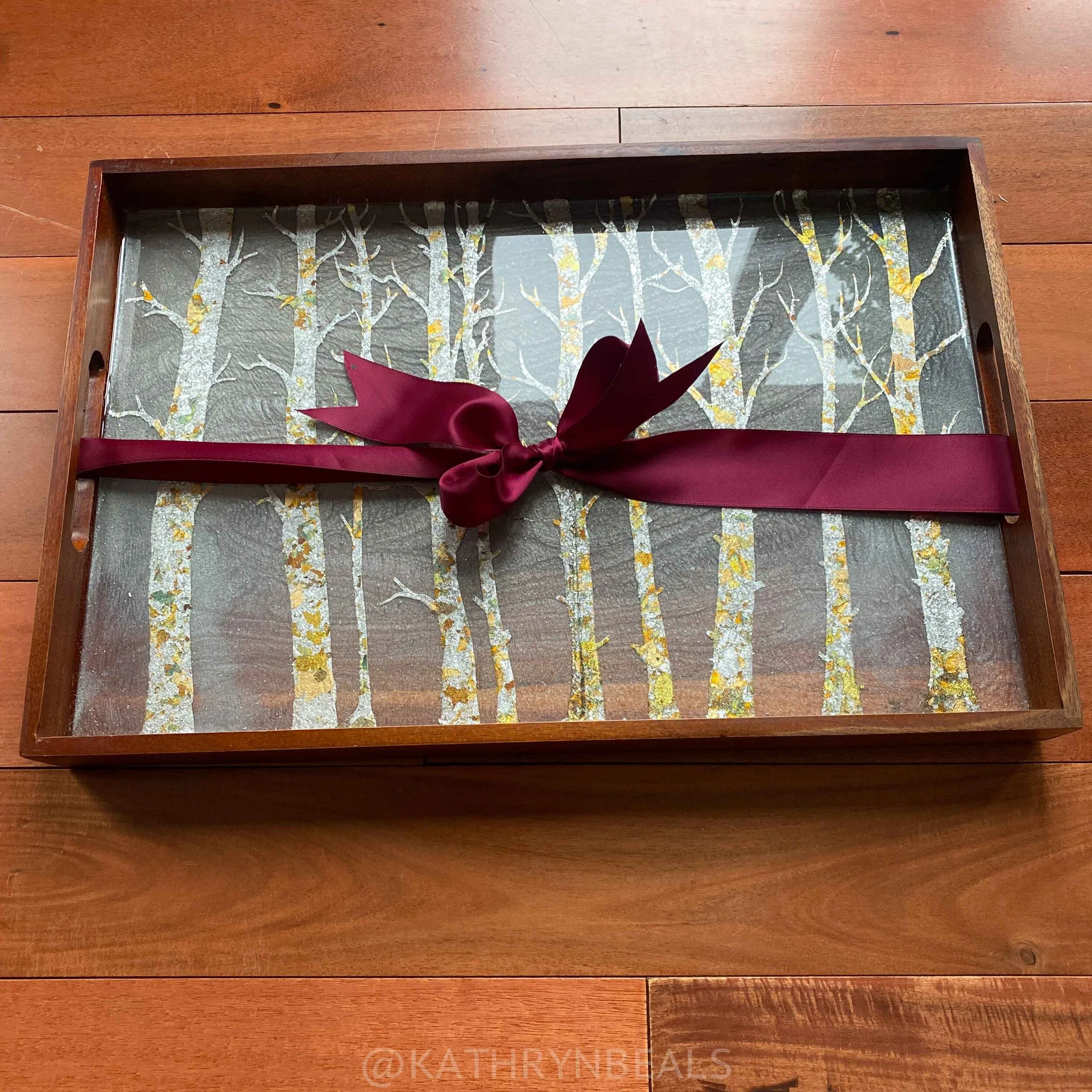 This is a one of a kind forest painting in metal and resin on a solid rectangular wood tray. There is subtle glitter in the resin to make it look like polished stone. The tree design is made by hand with metal leaf.
