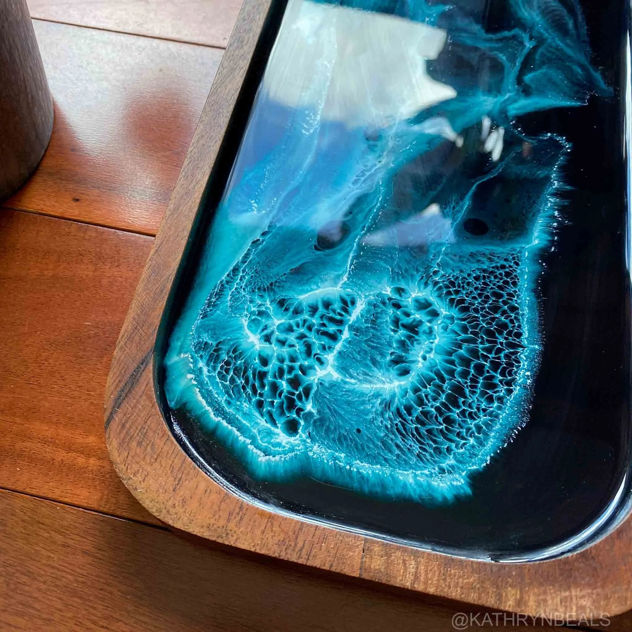 This is a one of a kind painting in resin on a solid acacia wood tray, in Kathryn’s Northern Waters style. The design is made by hand and features dark chaotic waves inspired by the ferry wake in British Columbia. These small trays are suitable to use as a valet tray or remote tray.