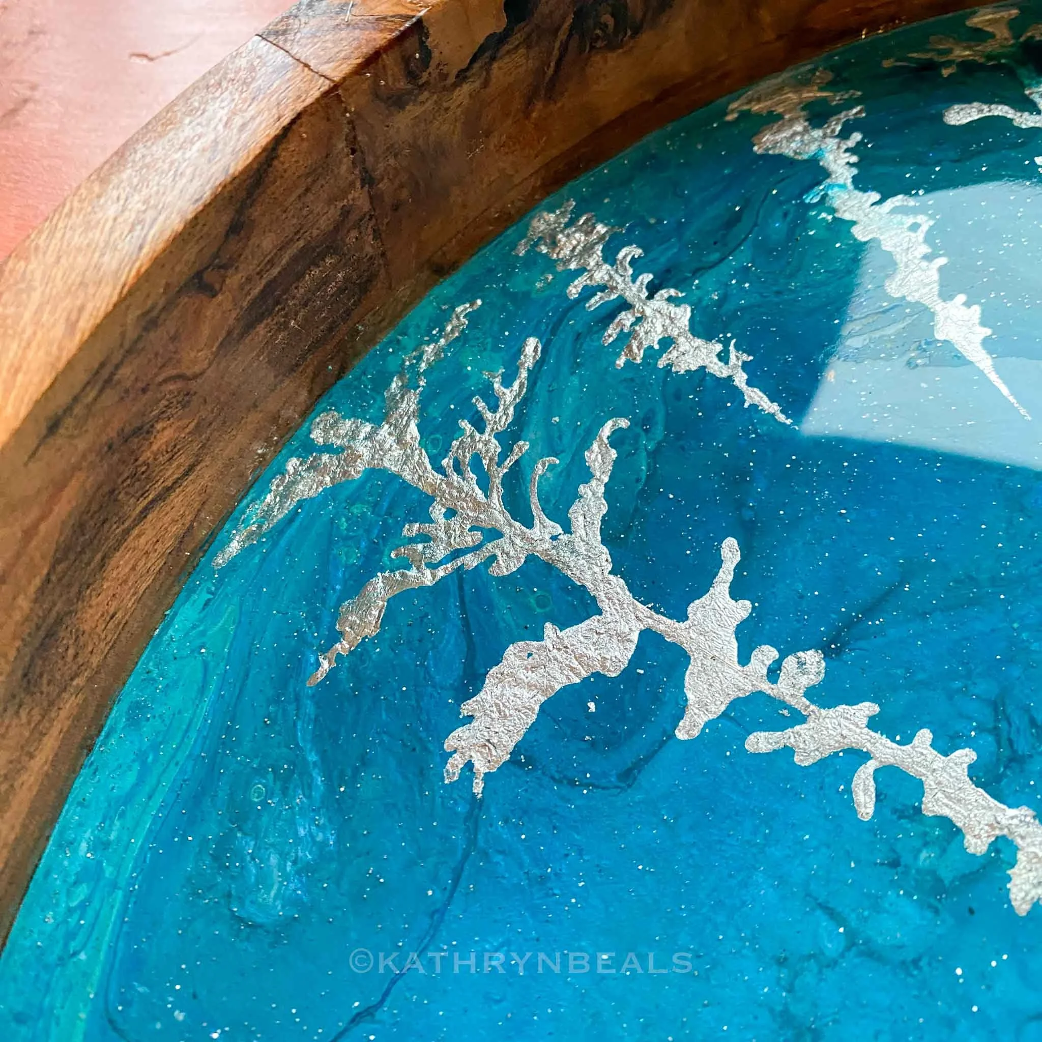 This is a handmade piece of art on natural acacia, and all handmade pieces will have small cosmetic bubbles or defects in the resin, or irregularities in the wood. Check photos carefully and message us for any clarifications.