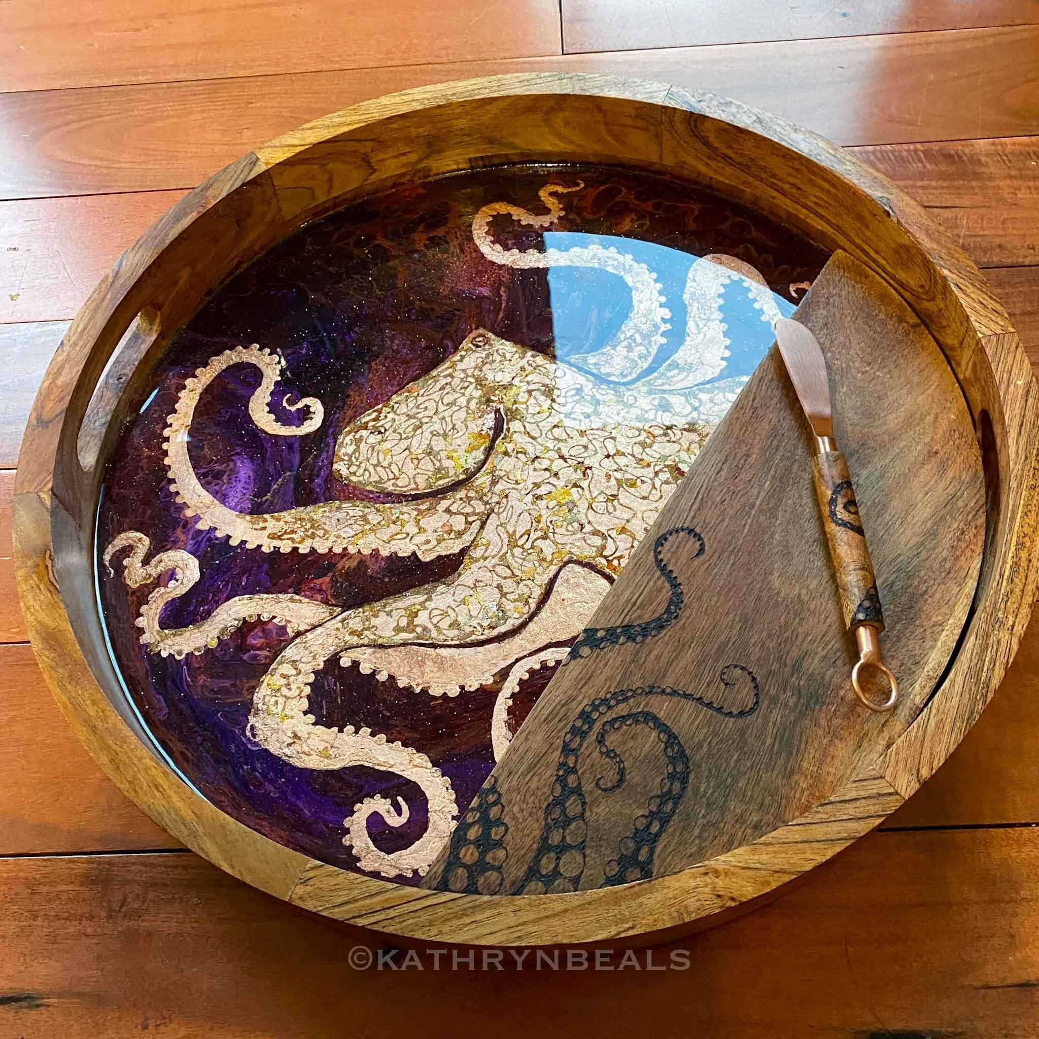 There is subtle glitter in the resin to make it look like polished stone. The design is made by hand with metal leaf and features a variegated copper octopus on a plum background.