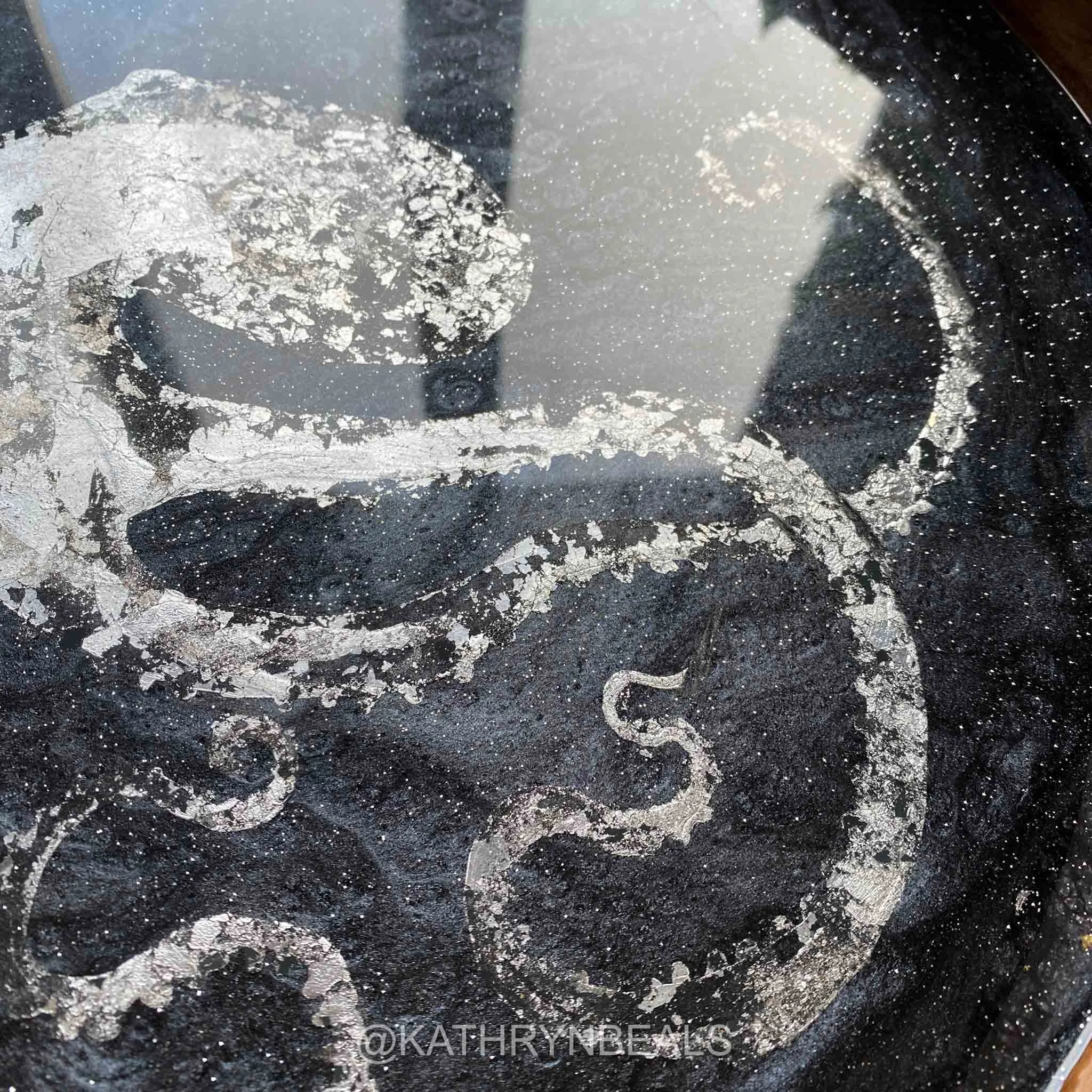 This is a one of a kind painting in metal and resin on a solid round wood tray. There is subtle glitter in the resin to make it look like polished stone. The octopus design is made by hand with variegated composite silver metal leaf.